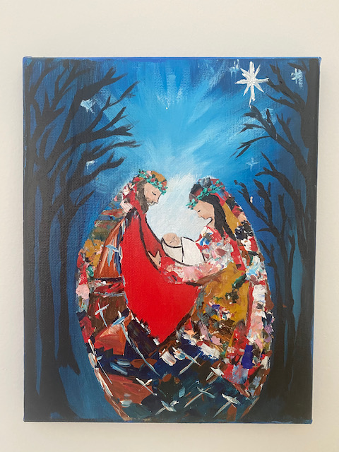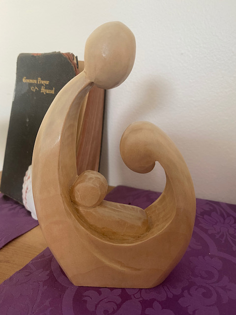 Julia has always given them to me as gifts. One oil painting from years ago, most recently a carved statue, in between, the painting of the Holy Family together we hung in our daughter’s nursery in preparation for her birth. In all, there is a quiet awe, a beaming sense of the holiness of these three people, together at last, often stretched together to become one form, in all the possibility of new life… It is a little like we dreamed for our family when Julia got pregnant.